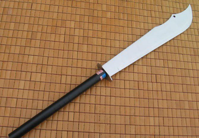 规格:CM 接上全长:133 未接全长:97cm 刃长:52 刃厚:0.35 刃材: 420不锈钢 刀刃硬度: 55HRC 表面处理:沙光 刀柄:铁管 刀鞘:假皮 重量:1900克(含套)