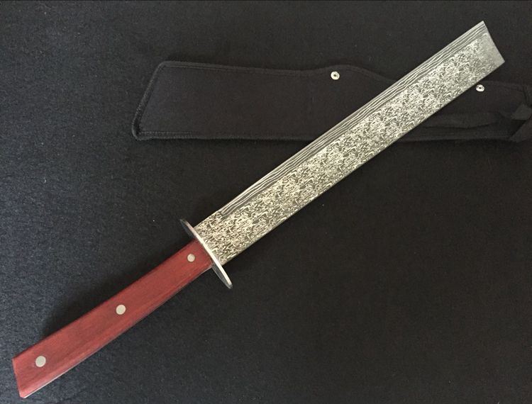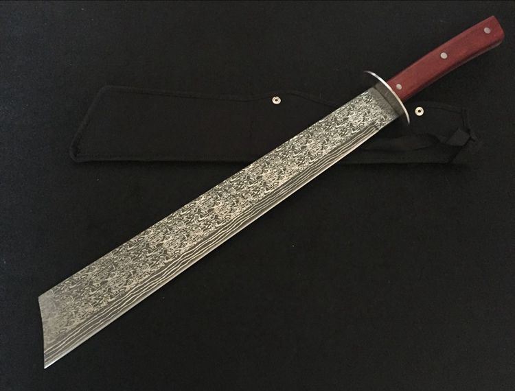 大马纹刀王方头砍刀 全 长:645mm 刃 长:450mm 柄 长:190mm 刃 宽:52mm 刃 厚:5mm 刃 材:5Cr13Wov 硬 度:57HRC 表 面:大马纹 柄 材:红木 锁 型:定锁 其 他:配布套